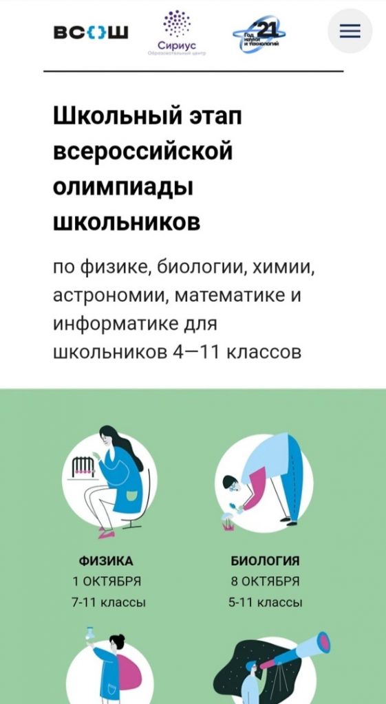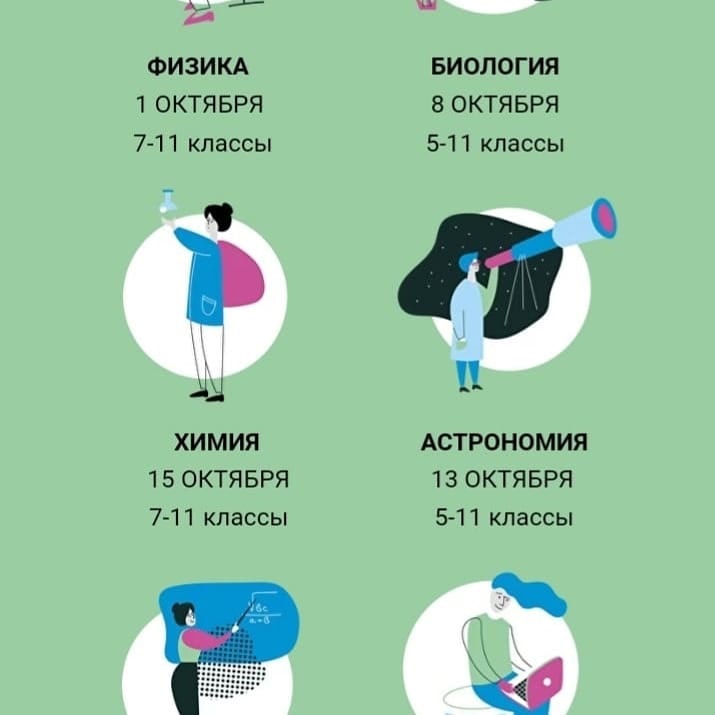 Школьный этап Всероссийской олимпиады школьников по физике, биологии, химии, астрономии, математике и информатике для школьников 4–11 классов пройдет 28 сентября – 29 октября 2021 года. Ожидается, что к олимпиаде присоединятся 68 регионов и около 5 млн участников.